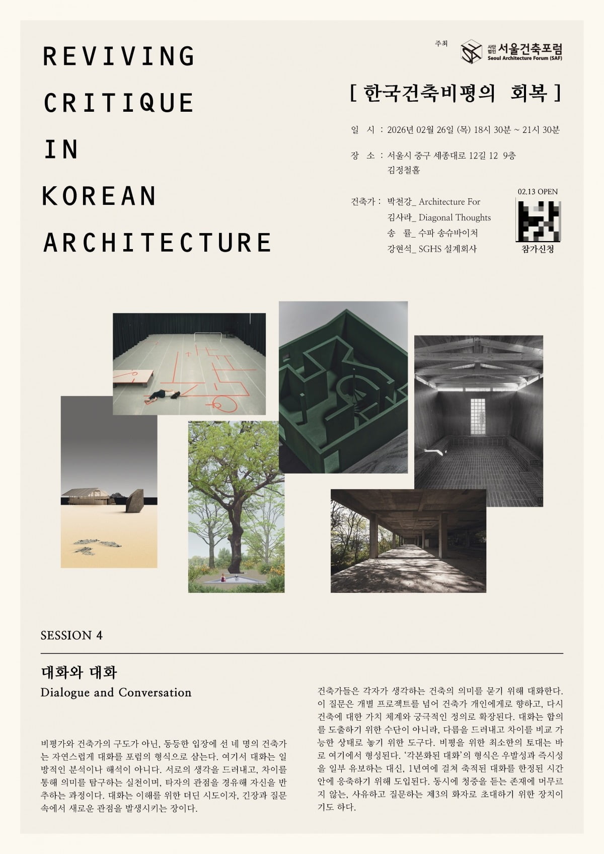국내외에서 주목받는 두 젊은 건축가, 김사라와 박천강의 독특한 작업 세계를 직접 경험해보고 싶지 않으신가요? ‘젊은 건축가 찾아라’라는 구호 아래 열리고 있는 서울건축포럼의 네 번째 비평회는 바로 그것을 가능하게 합니다. 이번 행사에서는 ‘대화와 대화’를 주제로, 이 두 건축가의 창작 활동과 사고 방식을 깊이 있게 탐구하며, 건축이 품는 다양한 의미와 그들의 작업이 불러일으키는 대화를 선보입니다.